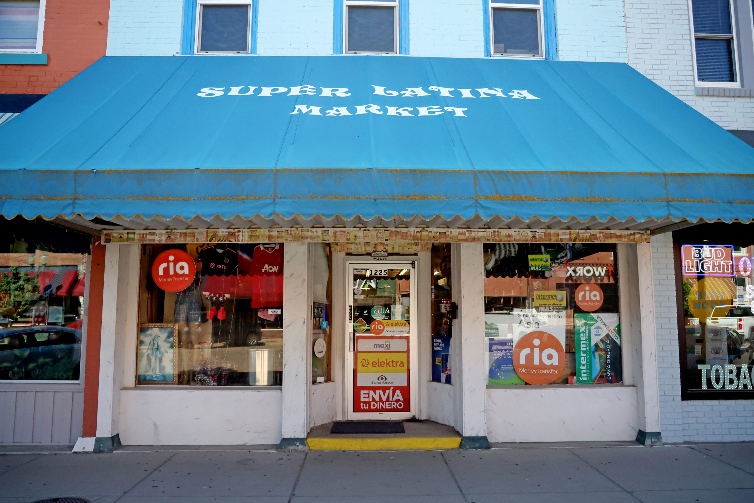 Left: A “Welcome” banner hangs on a lamppost in Crete. Right: Several stores along Crete’s Main Avenue are run by immigrants and have Spanish names. “When we came, it wasn’t much Latinos,” said Arminda Avelar, who works at the Super Latina Market. “But it was the possibility that you can really grow here.” (Photos by Aaron Stigile/News21)