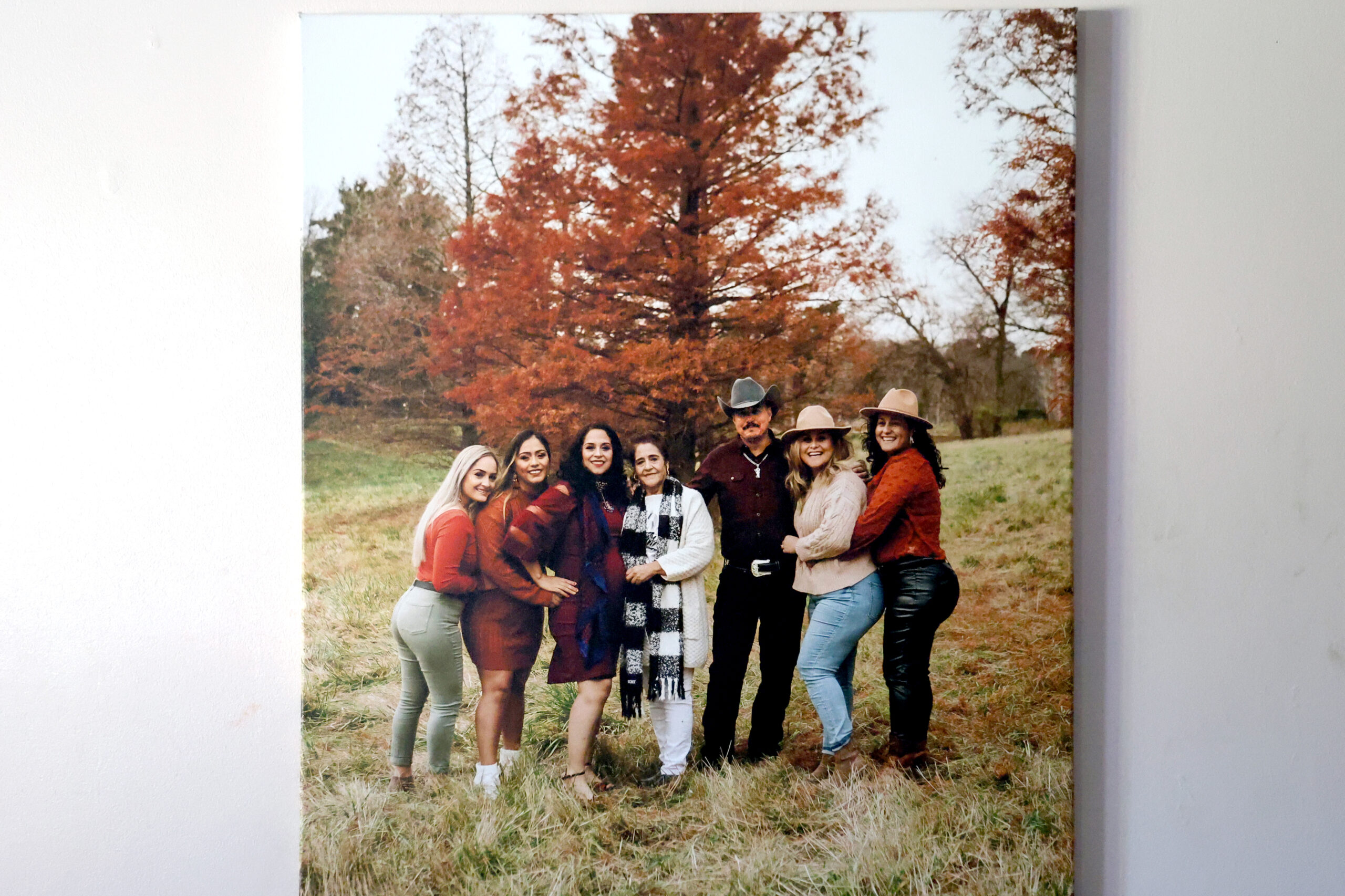 Left: Carely Adame Ortiz, a Crete resident, said that when the town became “Certified Welcoming,” it was a “very big deal.” “It just shows the community we are. It represents us.” Right: A photo of Carely Adame Ortiz and her family hangs on the wall in her living room in Crete. Adame Ortiz’s parents emigrated from Mexico to Crete before she was born. (Photos by Aaron Stigile/News21)