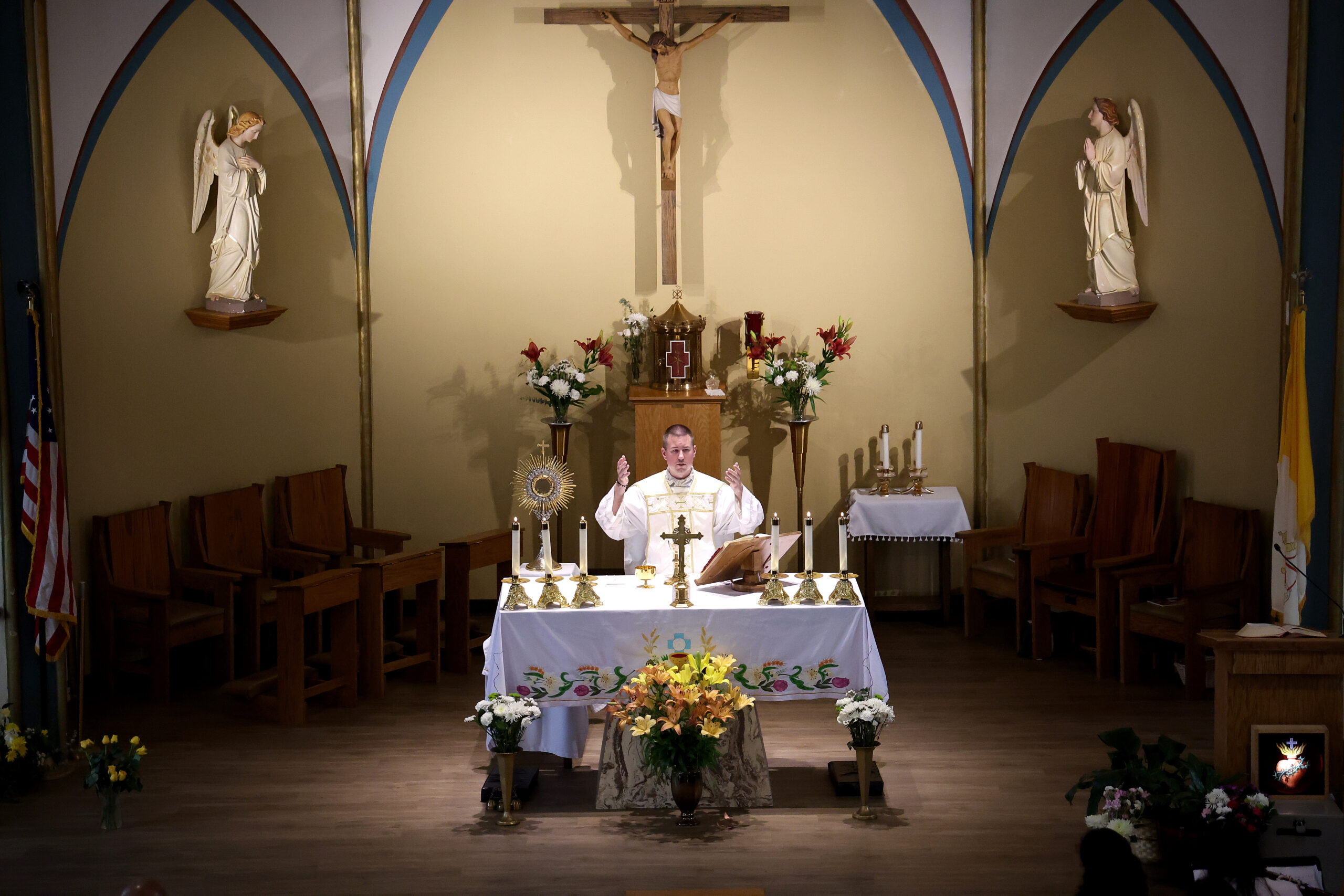 Draped in white and gold robes, the Rev. Christopher Stoley presses his palms together and looks out at the parishioners who’ve gathered after work for Friday Mass.