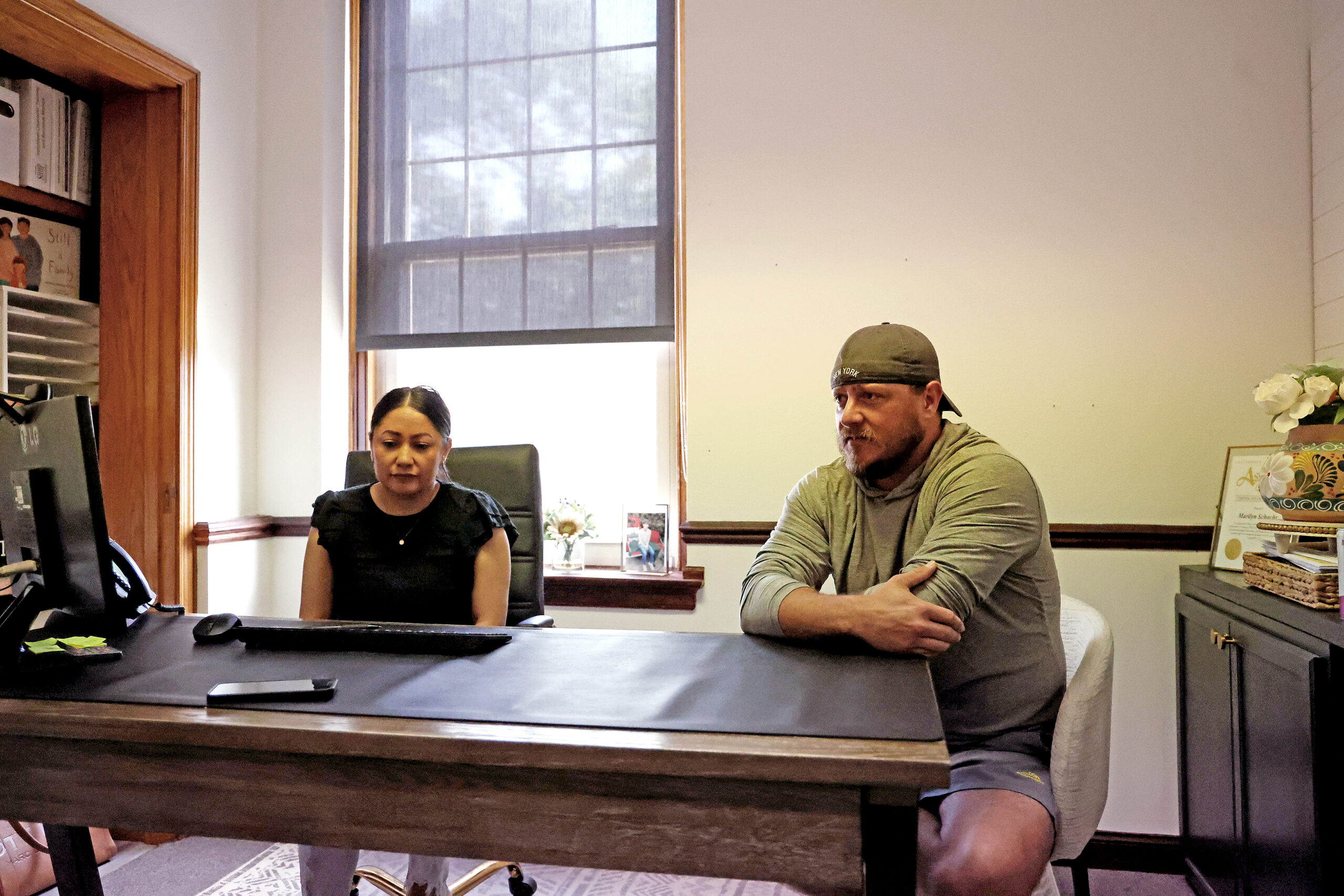 Marilyn Schacht, director of Crete’s Community Assistance Office, sits in her office with her husband, Ryan, an immigration services officer. Schacht emigrated as a child from Mexico with her family. (Photo by Aaron Stigile/News21)