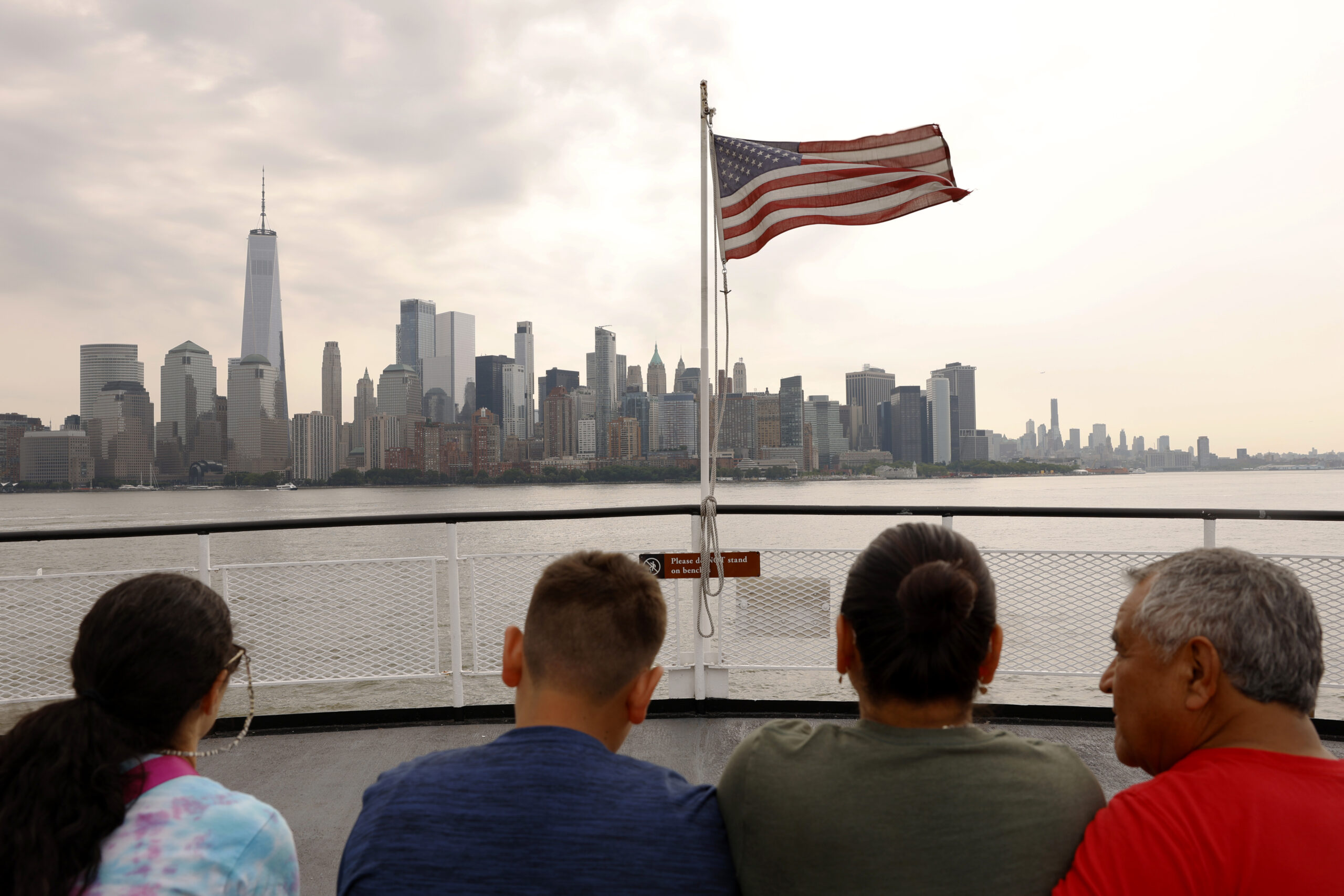 From left to right, Jessica Loomis, Louis Ramirez, Lizbeth Estrada and Reyes Estrada take the ferry to the Statue of Liberty. In July, the Trump administration sued New York City and its mayor, arguing the city’s sanctuary policies “impede the federal government’s ability” to enforce immigration laws. (Photo by Marissa Lindemann/News21)