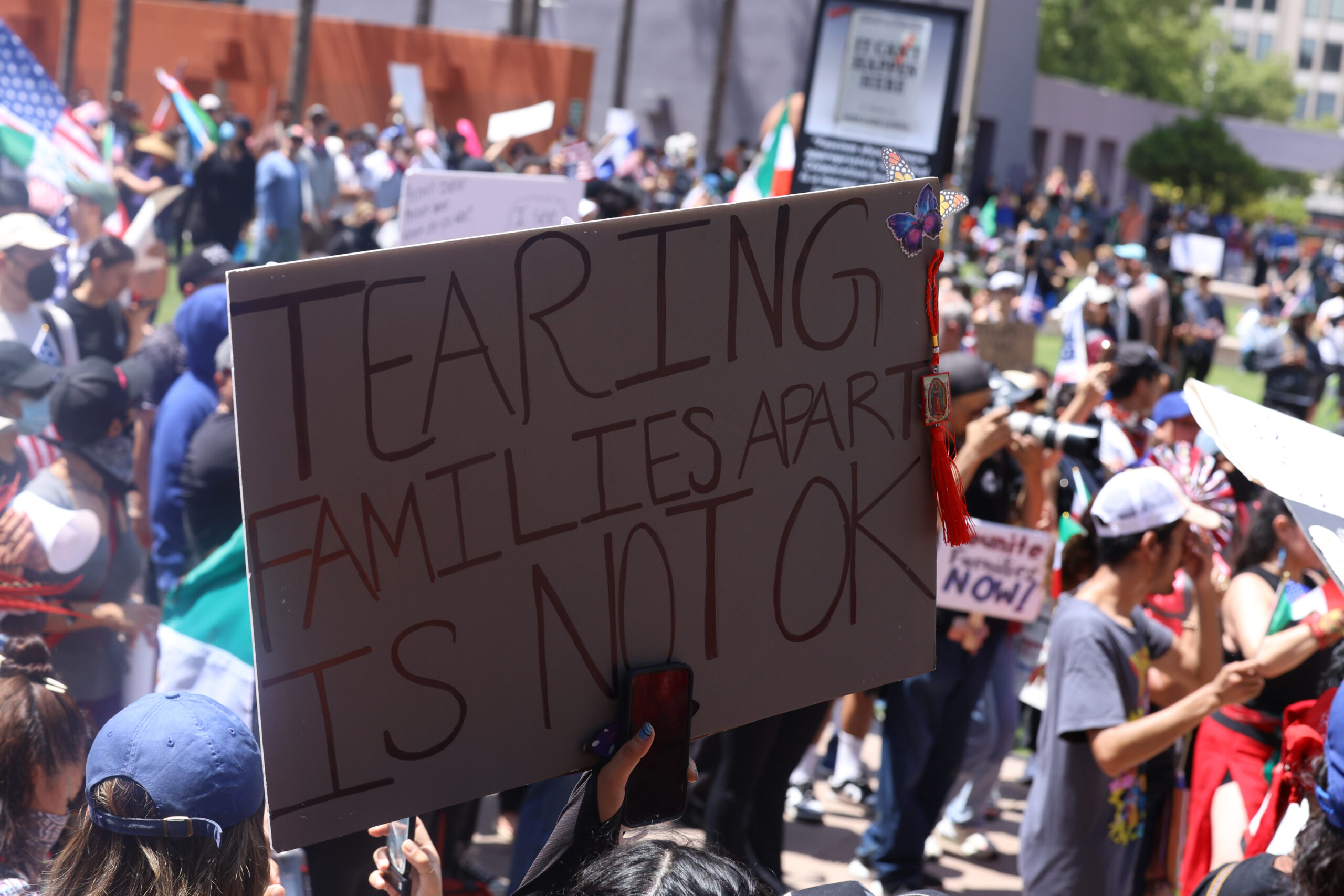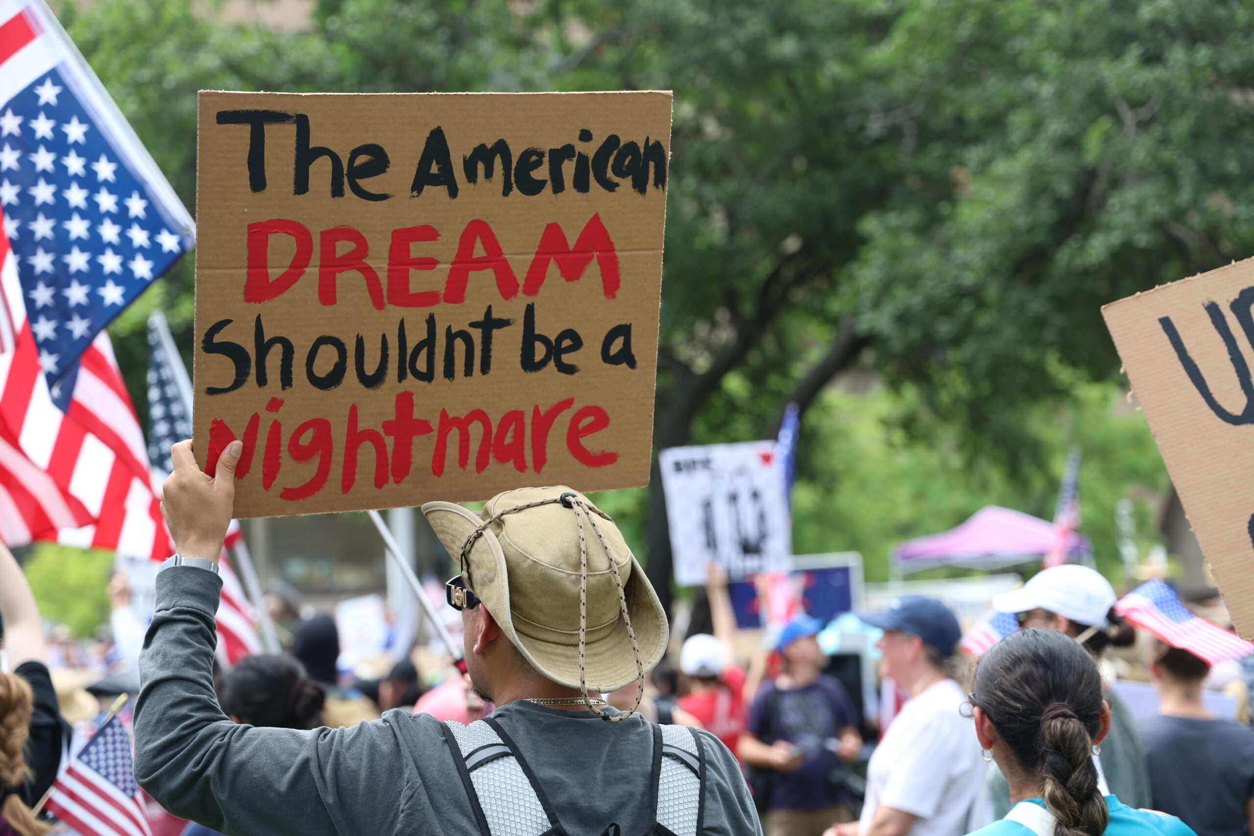 A protester at a demonstration on June 9, 2025, in Sacramento, Calif., holds a sign in support of those known as Dreamers, individuals who were brought to the U.S. illegally when they were children. (Photo by Sydney Lovan/News21)