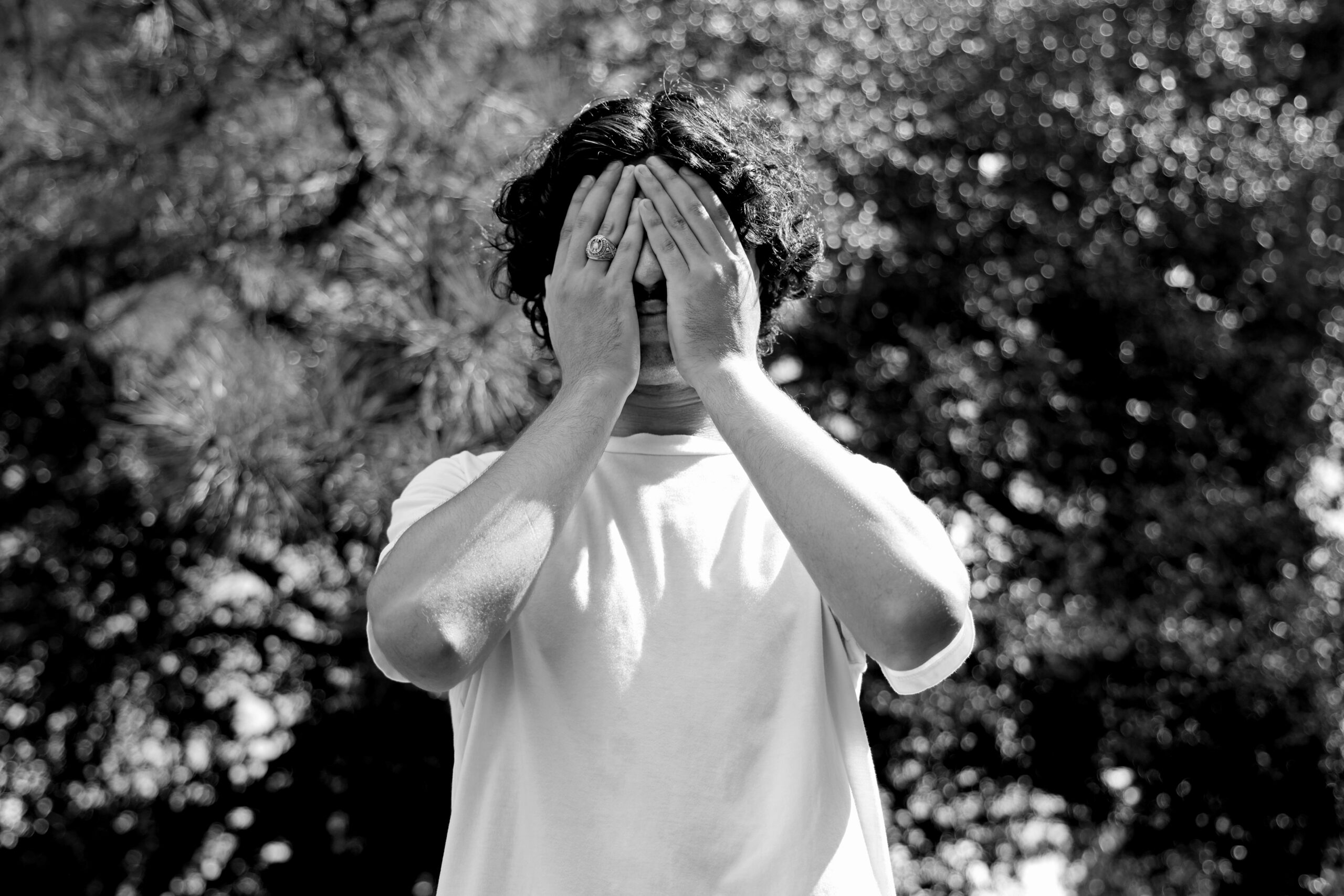 A.M., 24, covers his face for a portrait in Humble, Texas. A.M. became a DACA recipient when he was 15. (Photo by Tristan E. M. Leach/News21)