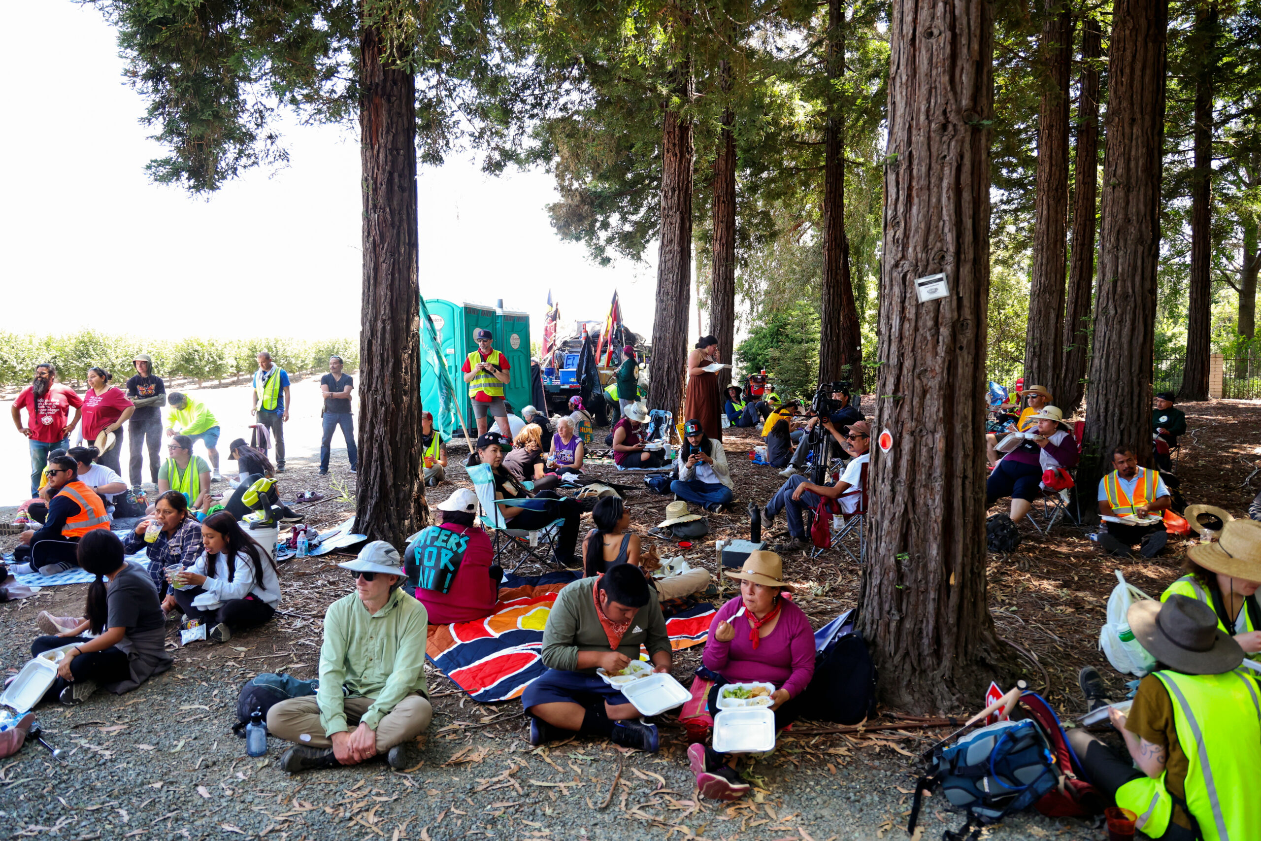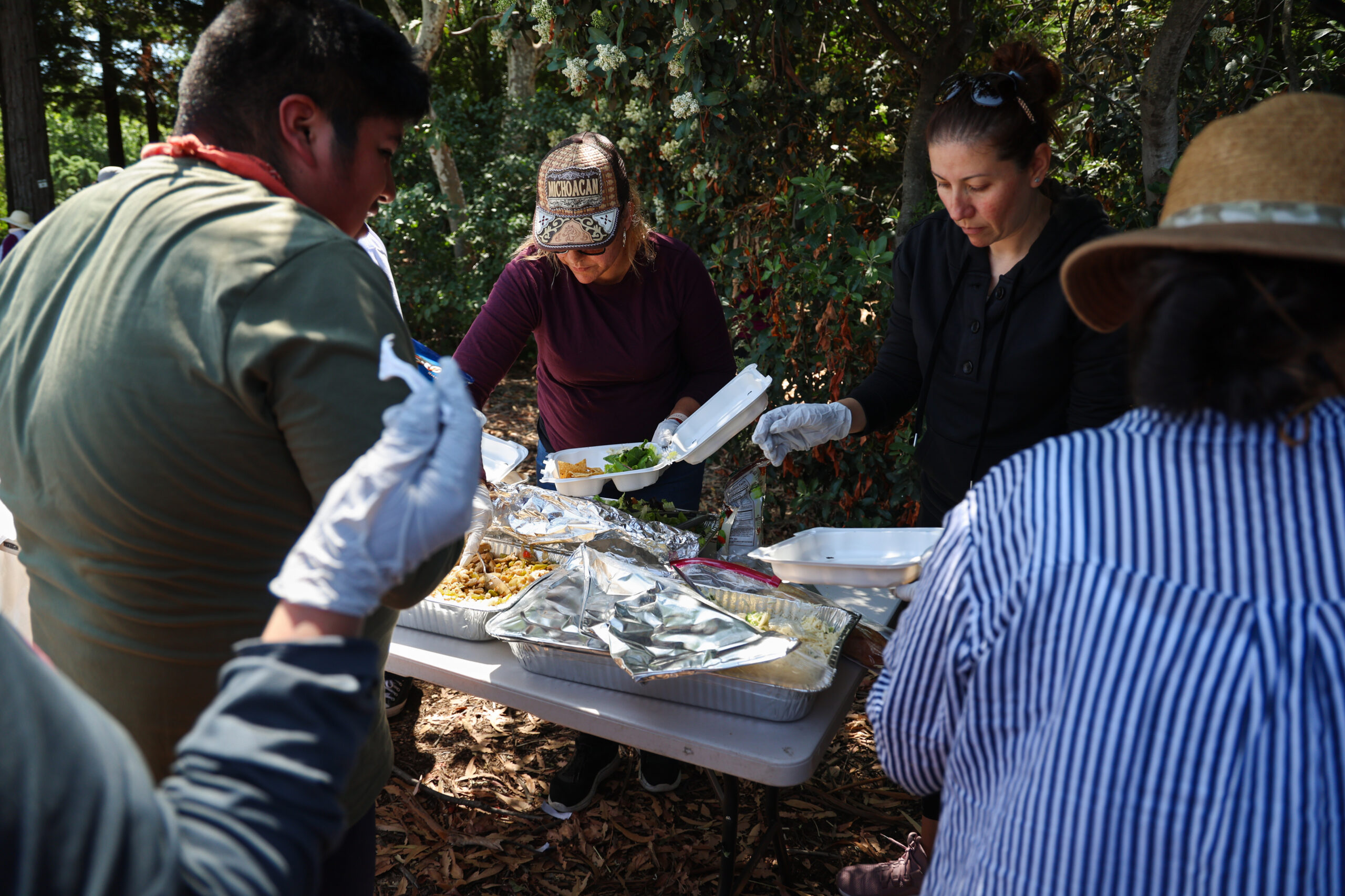 Marchers and volunteers stop for lunch on Day 1. Organizations from across California, including ALMAS Libres and East Bay Sanctuary Covenant, came together for the march. (Photo by Sydney Lovan/News21)
