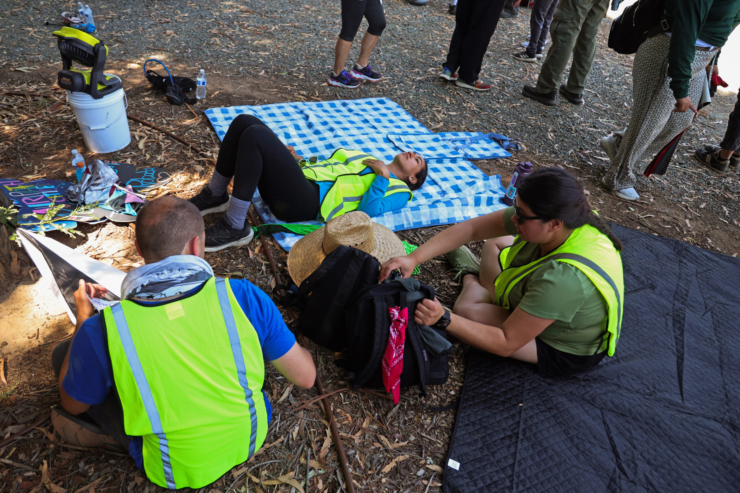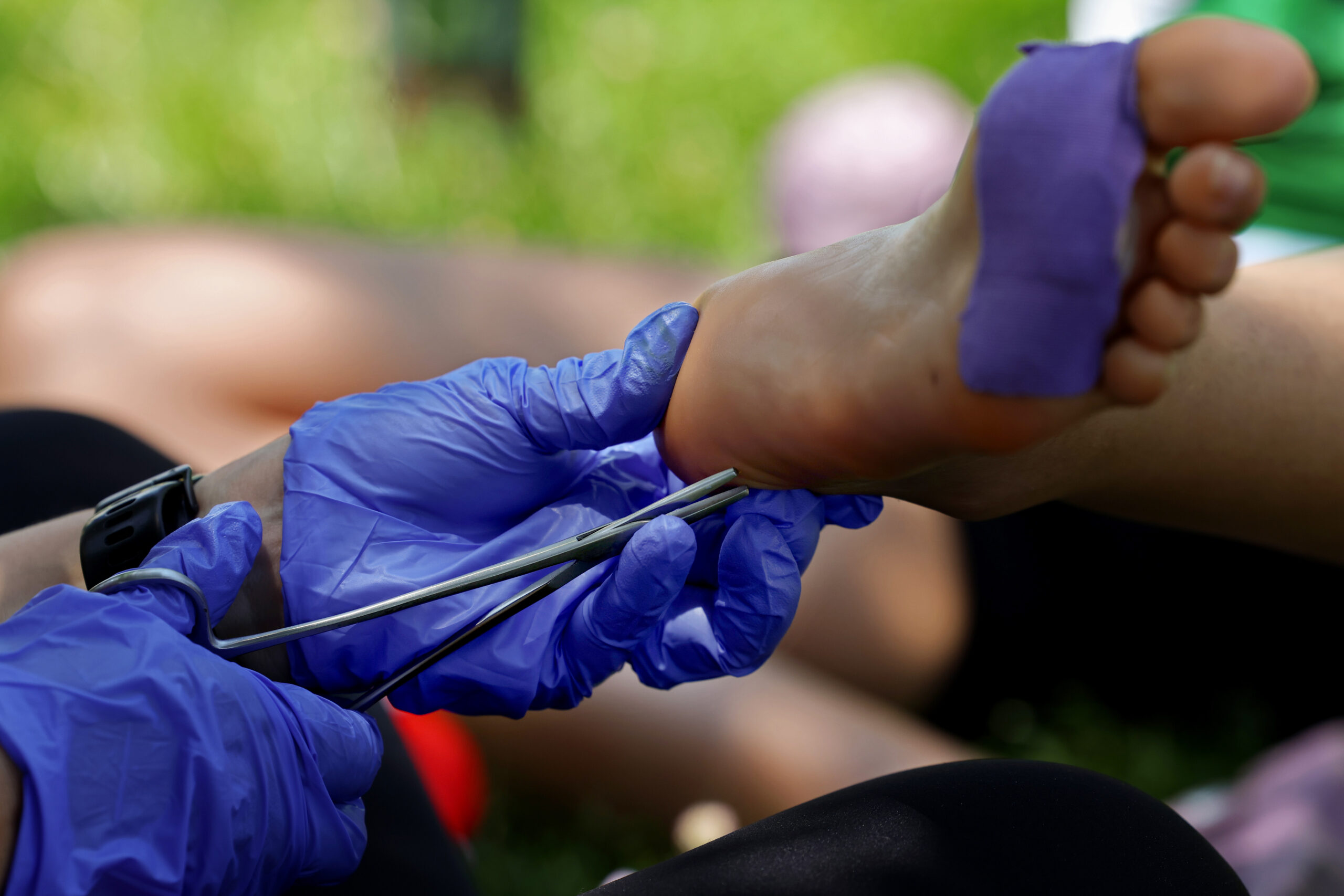 A walker gets care for blisters on June 9 in Sacramento. (Photo by Sydney Lovan/News21)
