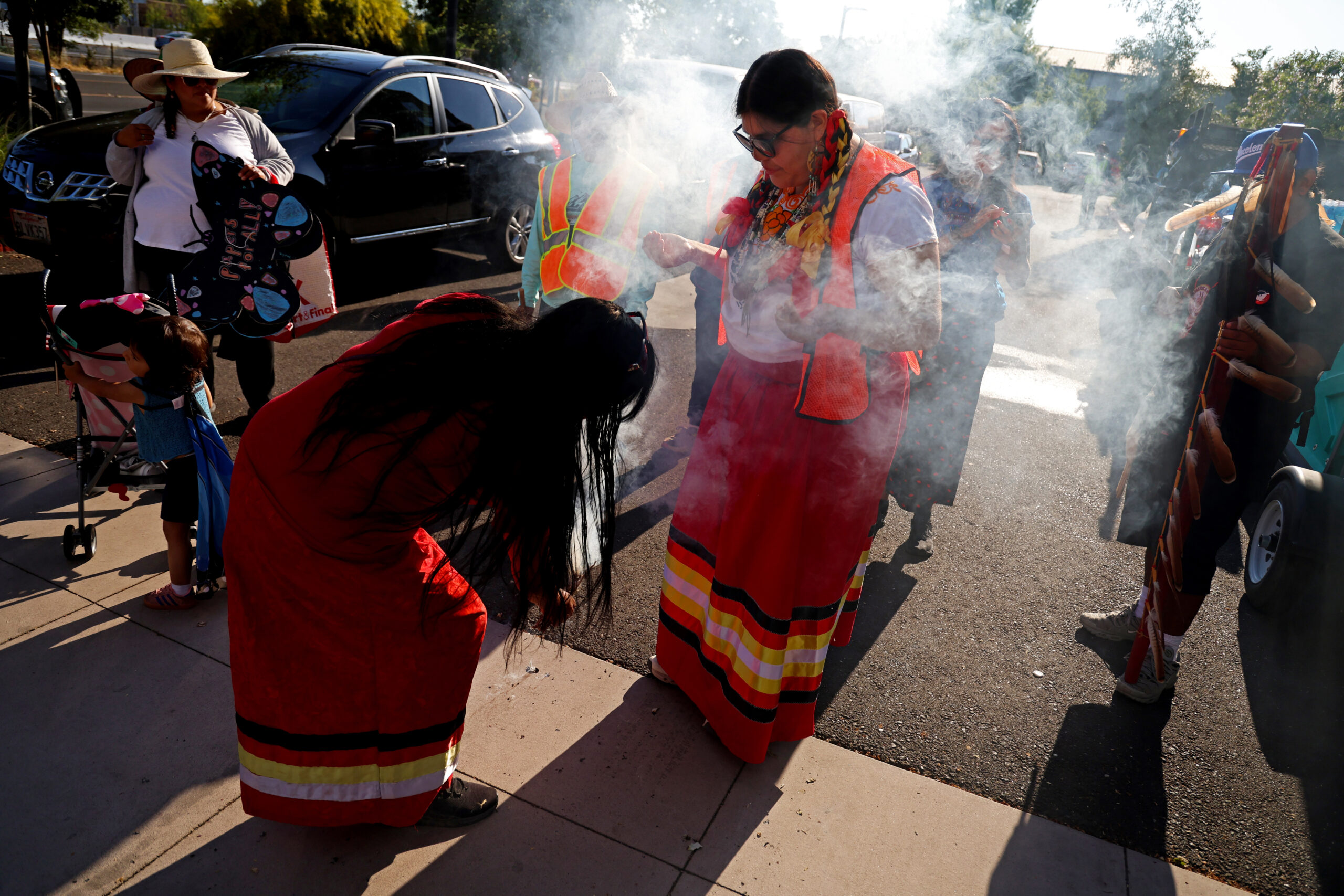 Lisa Peake, a member of the Pomo Tribe, burns sage around march participants in a ritual called smudging. Smudging is an important practice for many Indigenous cultures to cleanse and give protection. (Photo by Sydney Lovan/News21)